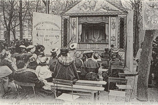 -Je vais aller chercher Guignol… Après la représentation, vous serez bien aimables et gentils de sortir par?…Par où?… C’est par là, la sortie.