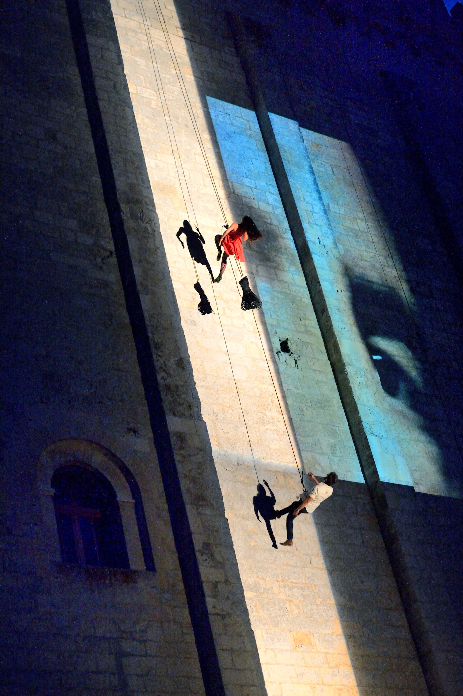 Les deux personnages sont en train de se battre ou de faire l’amour sur la façade d’una château royal . Qui l’eût cru ? La façade a sa personnalité, il faut l’apprivoiser, l’explorer, l’éprouver physiquement. Ballet insensé plus que du cirque. Les artistes ne sont pas seulement de talentueux acrobates, ils se font les interprètes d’une rencontre frictionnelle entre deux êtres qui font crisser leurs ailes le long d’un mur pour se sonder corps et âme, avec une témérité au propre comme au figuré à couper le souffle.