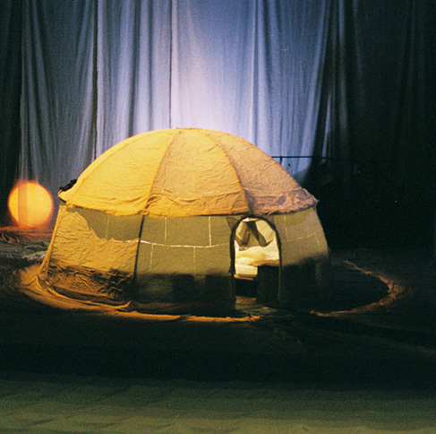 Il n’y a pas beaucoup de place dans cet igloo en toile, les spectateurs resserrés en cercle peuvent bien faire l’objet d’une hallucination collective : ils sont partis au Groenland et sont vraiment rentrés dans un igloo. L’espace d’une heure, ils n’auront pour tout repère que le plafond de l’igloo, et un sentiment d’empathie envers cet homme seul (l’enfant que nous fûmes peut-être jadis, isolé dans un grenier, une cave, ou une cabane) Robinson Crusoé nordique, victime de la maladie du Vertigo.