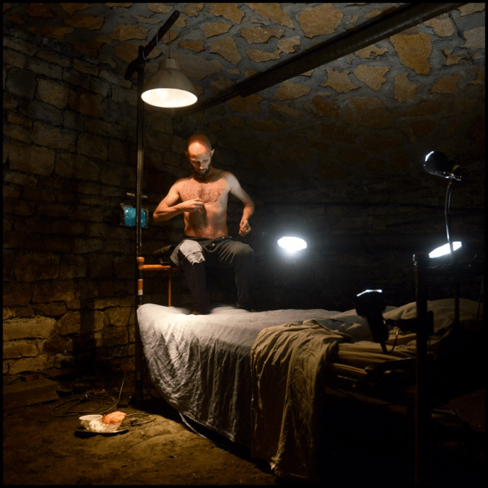 L’artiste s’est familiarisé avec tous les recoins de la cave qui lui était inconnue deux heures auparavant, il est quasiment nu, c’est son corps, sa chair qui expriment fébrilement son rapport aux choses, aux éléments, aux êtes invisibles qu’il est possible d’imaginer se réveiller au fur et mesure du délire de l’homme malade de ses nerfs.