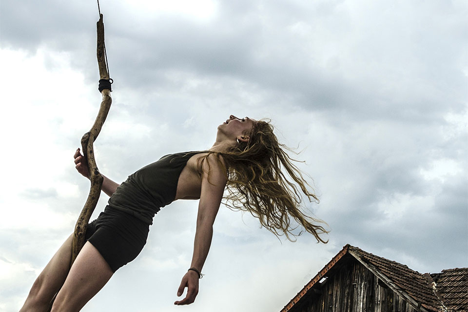 Nous pensons qu’à chaque représentation, la danseuse aérienne Kamma ROSENBECK dépose un secret au cœur de la branche. Ce genre de secret que nos yeux gourmands doivent recouvrir d’un voile, faute de quoi le charme serait rompu. La jeune nymphe nous fait signe à travers la branche talisman qu’il s’agit d’un rêve : elle s’habille, elle se déshabille au milieu d’une forêt de regards qui retiennent leurs souffles , elle est mue par la seule force vitale de son corps à l’écoute de l’esprit du hêtre, de sa musique à cordes imaginée par Thomas Barrière.