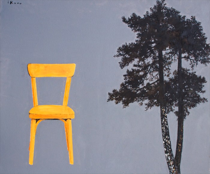 Ikiou, artiste têtu à plusieurs têtes, peintre Coréen, influencé aussi bien par Cézanne que par Braque, inaugure le chant d’arbres dans cette plus vaste forêt, pour devenir l’interprète inespéré d’un dialogue trépidant entre l’orient et l’occident (C’était le bâton de pèlerinage de Malraux), une sorte de récréation continue, tel un pêcheur très humble lève l’ombre, sans confondre le reflet de la lune avec sa canne à pêche, pour rester à l’écoute, caché derrière l’arbre totem.