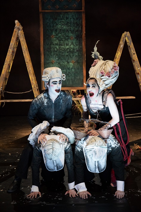 Dans le spectacle qui réunit deux marionnettes celle de Gwynplaine et de Déa et plusieurs comédiens, la metteure en scène Claire Dancoisne s’est visiblement imprégnée de la charge éruptive et baroque du verbe hugolien avec son propre imaginaire où se mêle sa fascination pour les créatures qu’elles soient objets, humaines ou marionnettes.