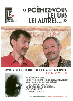 Des chansons de Bernard Haillant, Gainsbourg, Prévert et des créations originales sur des poèmes de Cherasim Luca par Vincent Bouchot, ténor, et Claude Georgel, saxo aux arrangements et aux compositions.